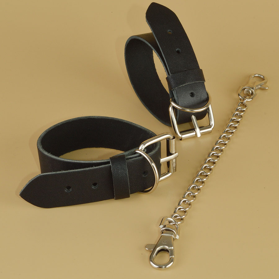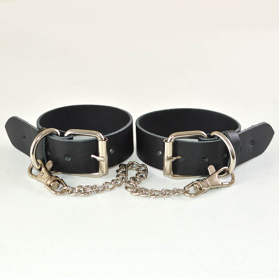 Оковы изготовлены из натуральной кожи. Регулируются пряжкой, имею цепочку с карабинами, длина 24см. Ширина браслета 2,5см. Обхват минимальный 19см, максимальный 26см. Длина упаковки 16, ширина 10, высота 8 см. Вес брутто 100 г.