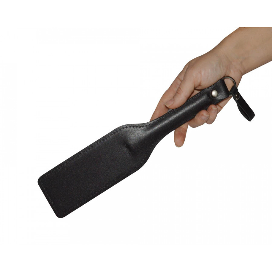 Шлепалка изготовлена из натуральной кожи. Рукоять имеет жесткую основу. Общая длина шлепалки 30 см, ширина 6,5 см. Цвет черный.