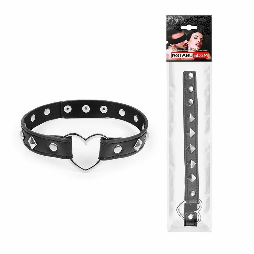 Оригинальный ошейник для любителей БДСМ-игр, декорированный металлическими украшениями. Имеет возможность регулировки размера с помощью ремешков.